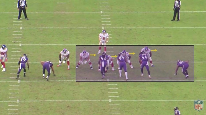 To make sure they could handle those 4 potential pass rushers, the Giants used a 4-man slide to their left: