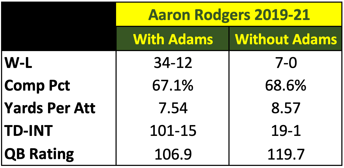 Aaron Rodgers has won two MVP’s and led the Packers to a 41-12 record since 2019. And during that time, he hasn’t really struggled when Adams has been out of the lineup: