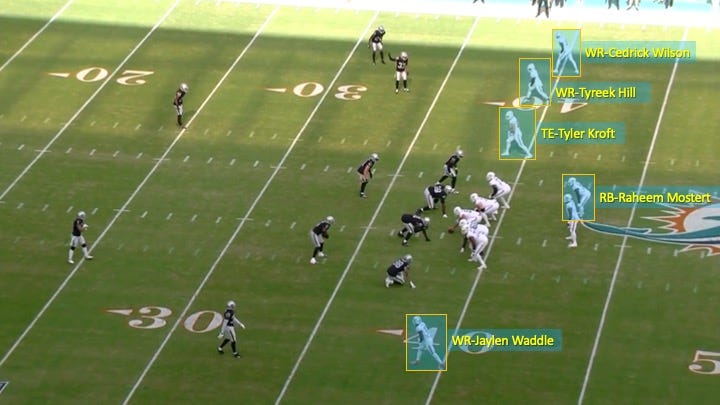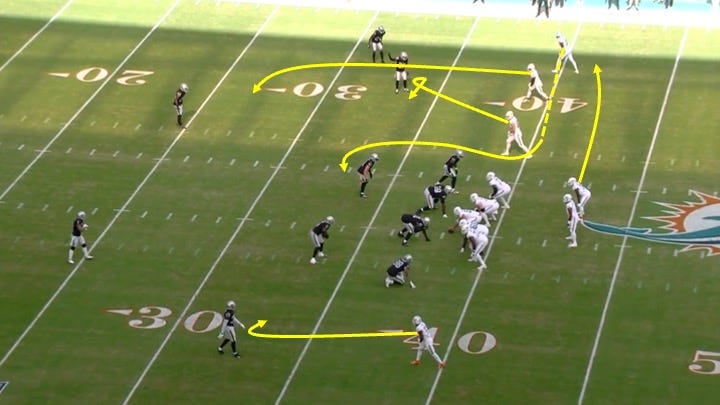 On this play, Miami came out in a 3x1 formation with the running back offset to the right. That put 4 pass catchers to one side: