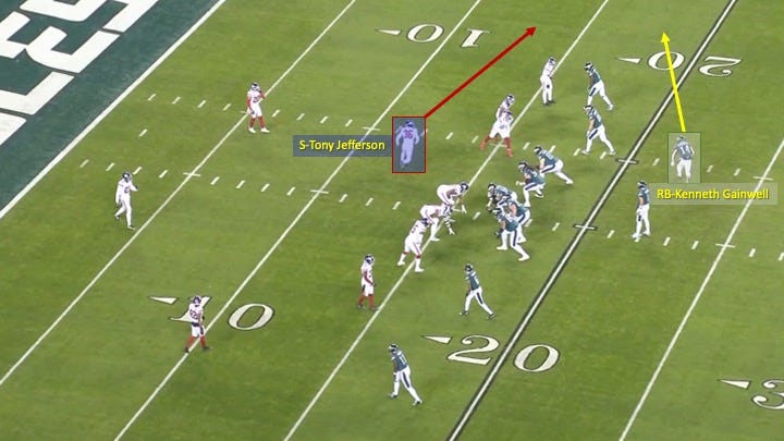Later in the drive, Philly faced a 3rd-and-5 from the Giants’ 16-yard line. The Eagles started in a 2x2 set and motioned running back Kenneth Gainwell from the backfield to the perimeter. Safety Tony Jefferson followed him, an indicator of man coverage: