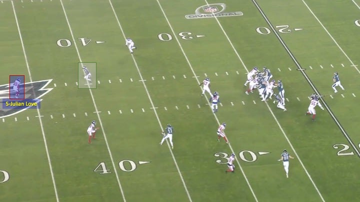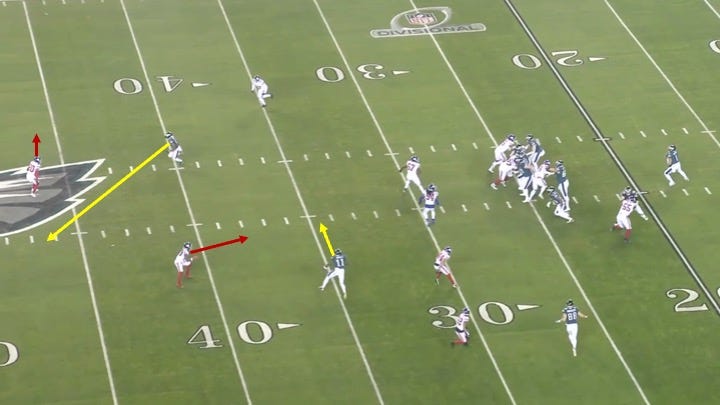 Knowing it was man, Hurts could pick the route combination or matchup he liked best. He chose tight end Dallas Goedert running a stutter-out underneath Zach Pascal’s quick-in on a designed pick play: