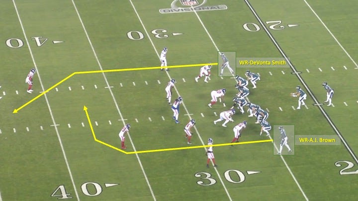 On their second play from scrimmage, the Eagles threw their first big punch of the game and attacked downfield with a post-dig route combination off of play-action:
