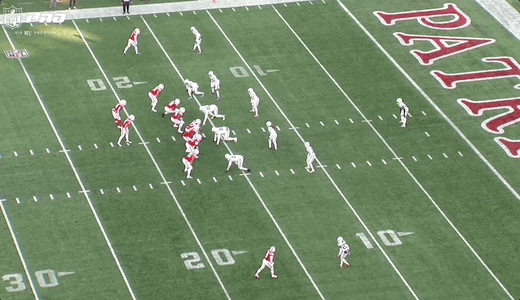 Below, he did a great job responding to the blitz and using his physical talent to get the ball out on a throw across his body despite free rushers bearing down on him: