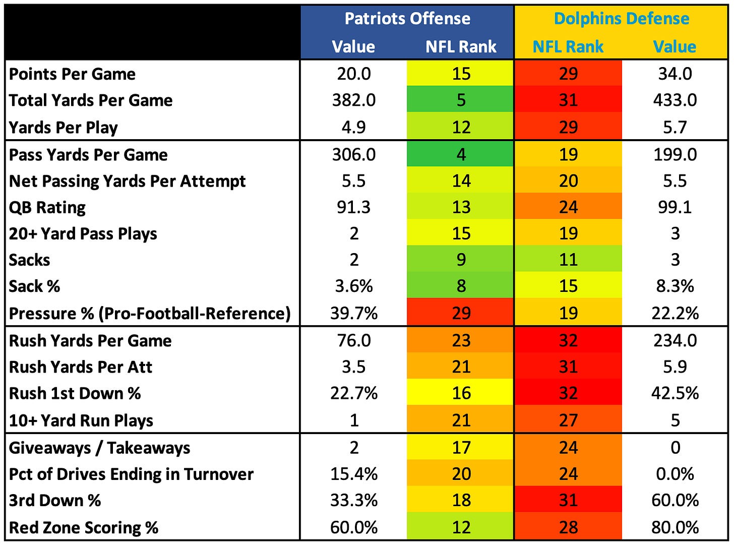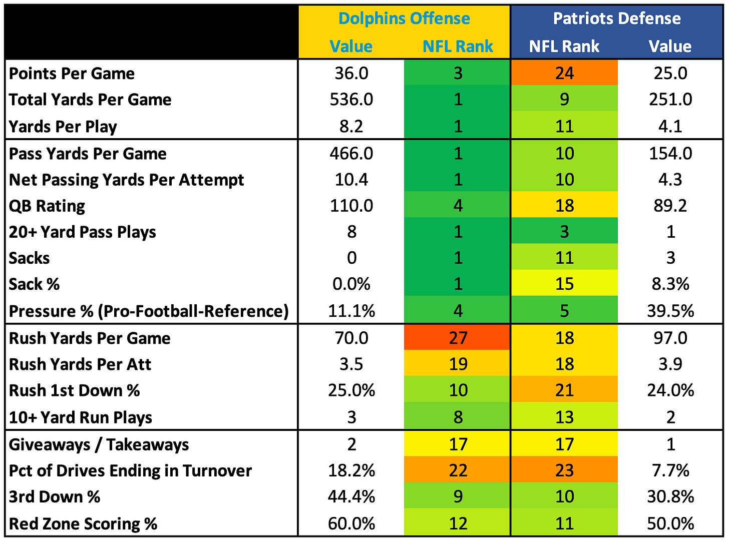 It’s Week 2, and as we mentioned last Thursday, we like to provide previews of every NFL game each week based on team stats (Below is an example from the Dolphins-Patriots game). Remember, we’re not comparing one offense to another offense, since they’re never on the field at the same time. Instead, we’re taking a look at how each team’s offense matches up to that week’s opponent on defense, and vice versa.