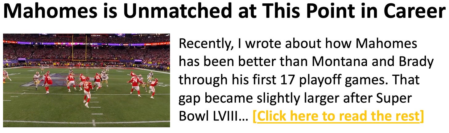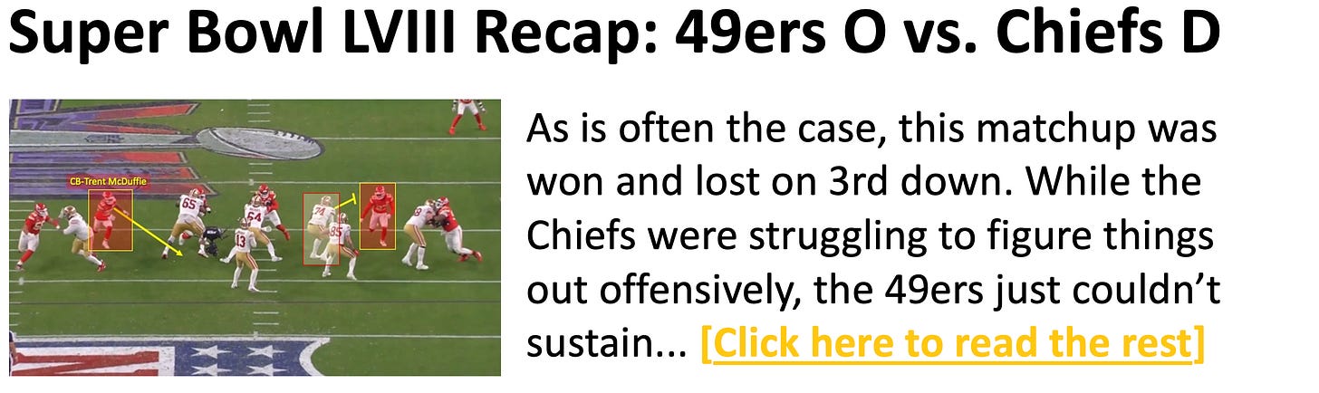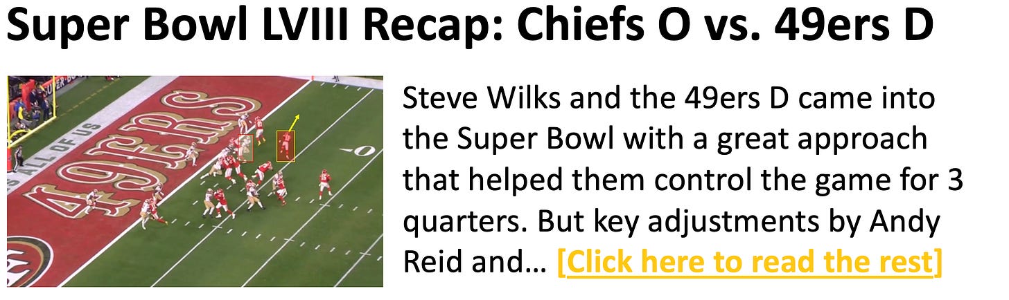 Football Film Room Weekly NewsletterWeek of February 12thNick KehoeFeb 17, 20242ShareThis week at Football Film Room…SubscribeNow that we’ve entered the offseason, we’ll be sending out this newsletter recapping our posts on a monthly basis instead of weekly. We’ll resume the weekly cadence next season.PreviousNext