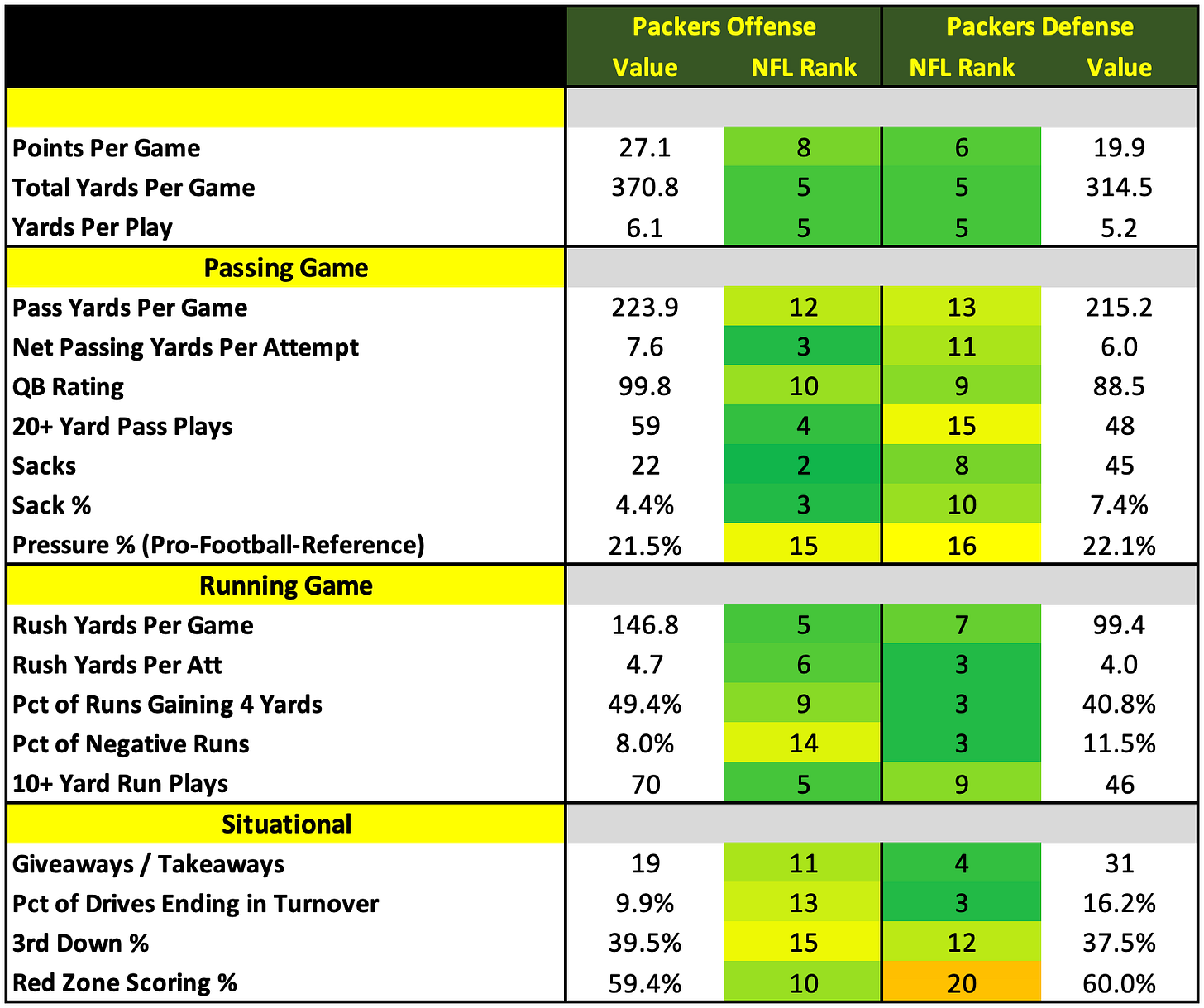 Defensively, Green Bay was solid against the pass and good against the run (finally!). They generated the 4th most takeaways in the NFL. Under new defensive coordinator Jeff Hafley, they mixed in a healthy amount of disguise, were among the league leaders in use of stunts, and finished 5th in frequency of simulated pressures according to