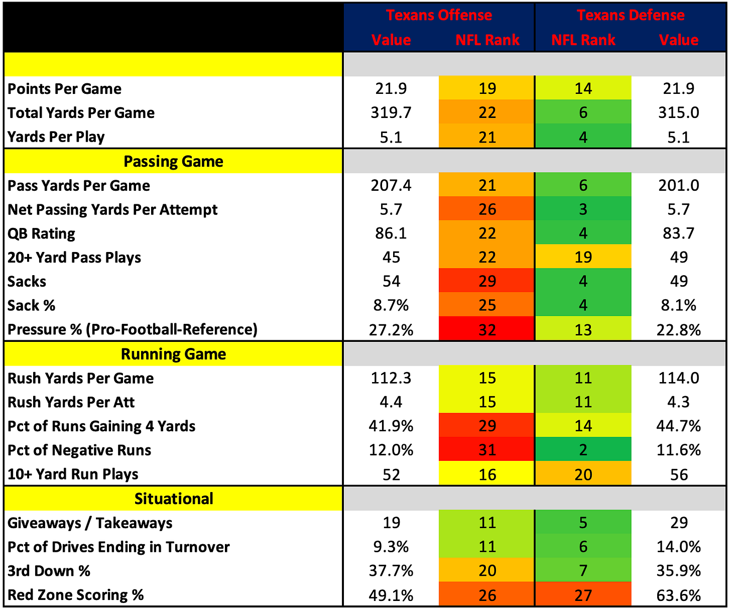 This certainly played a key role in the passing game’s struggles. But the bigger reason was likely the offensive line. Houston was unable to protect C.J. Stroud, finishing dead last in pressure percentage allowed and 29th in sacks. It clearly impacted Stroud, who looked like an uncomfortable quarterback for much of the season.