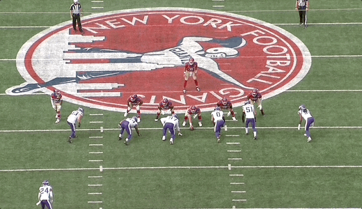 Fast forward to the pick-6 on New York’s next drive. The Giants came out in an empty formation and the Vikings matched up with 6 men on the line of scrimmage pre-snap:
