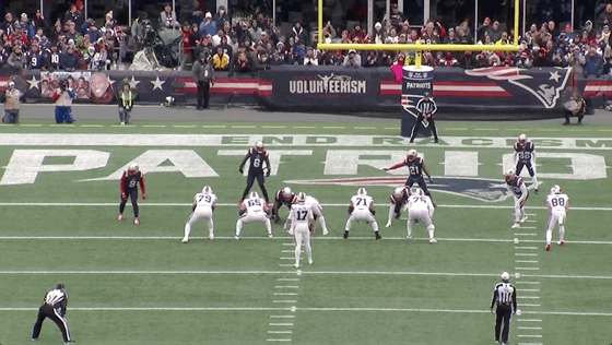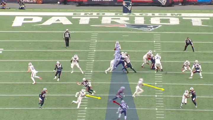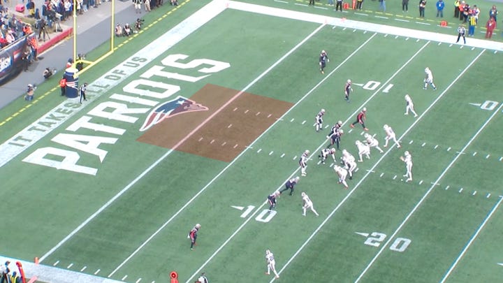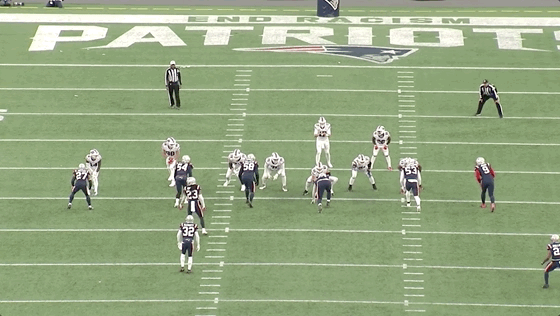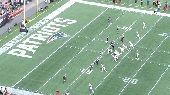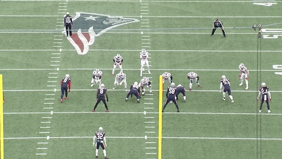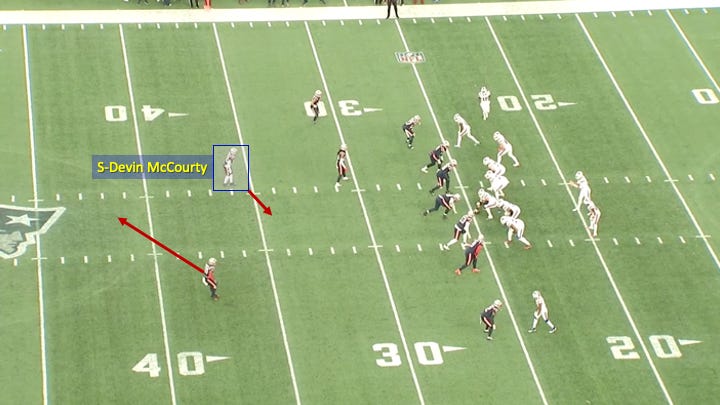 The Patriots would rotate to Cover-1 (man free) with safety Devin McCourty lurking in the middle of the field to help out on any in-breaking routes:
