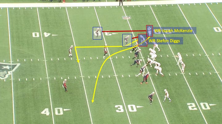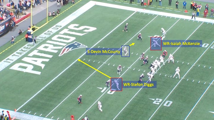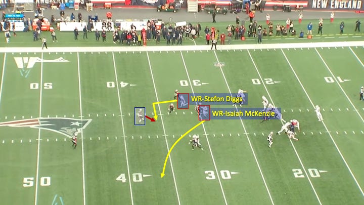 New England was again playing man coverage and it was unclear pre-snap exactly where the help defenders would come from. Focus on Stefon Diggs and Isaiah McKenzie on the right side of the formation, running a dig and a deep-crossing route respectively: