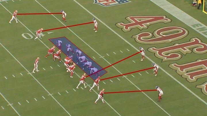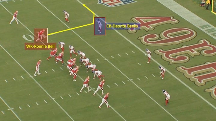 Against cover-0, quarterbacks don’t work through progressions. They pick their favorite matchup or route and make the throw to beat the coverage. Here, Purdy liked Ronnie Bell’s route from the slot against Deonte Banks:
