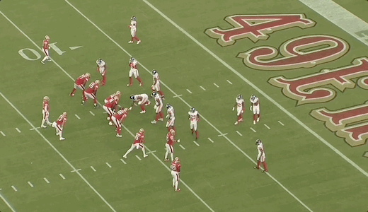 There were plenty of other plays from Thursday night where Shanahan created a clean pre-snap picture for Purdy. On this next example, the 49ers came out in “22” personnel (2 RB, 2 TE) and an I-formation. Then they shifted. Fullback Kyle Juszczyk and running back Elijah Mitchell motioned to the perimeter. Giants linebackers Bobby Okereke and Micah McFadden followed:
