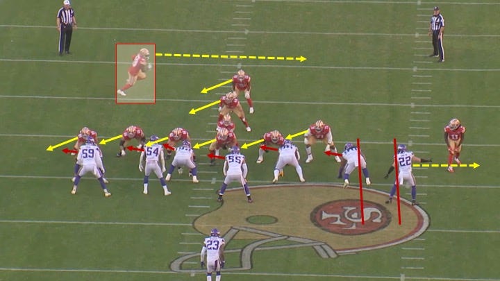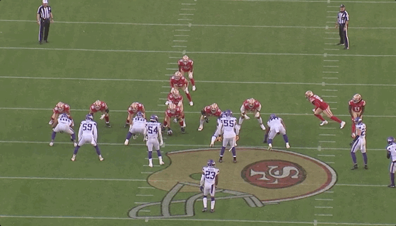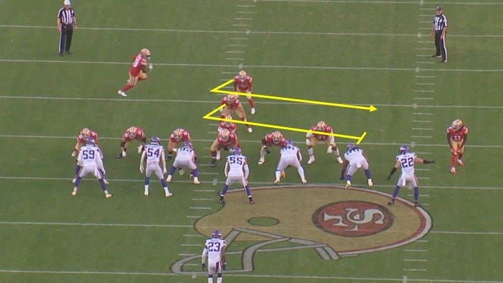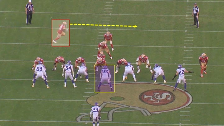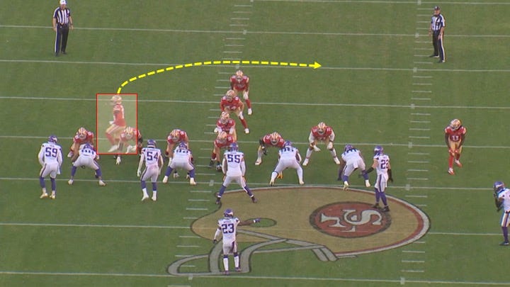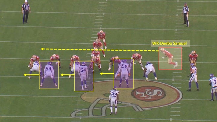 Before the snap, wide receiver Deebo Samuel motioned across the formation, getting Minnesota linebackers to shift to the motion side: