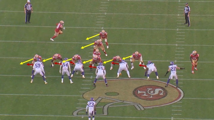 Shanahan uses shifts, motion, and misdirection to create running lanes as well, if not better, than any offensive mind in the NFL. Take this play against the Vikings as an example.