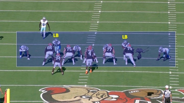 The first example of this was a 3rd-and-10 on the Browns’ opening drive. The Cowboys would drop two linebackers down into the B-gaps pre-snap, creating a 6-man front: