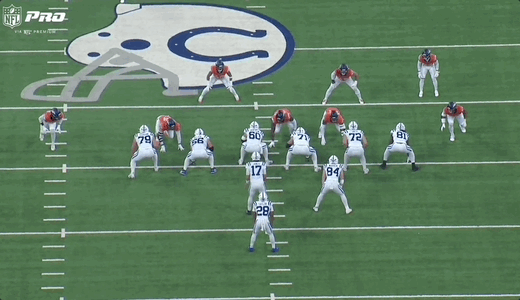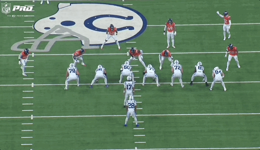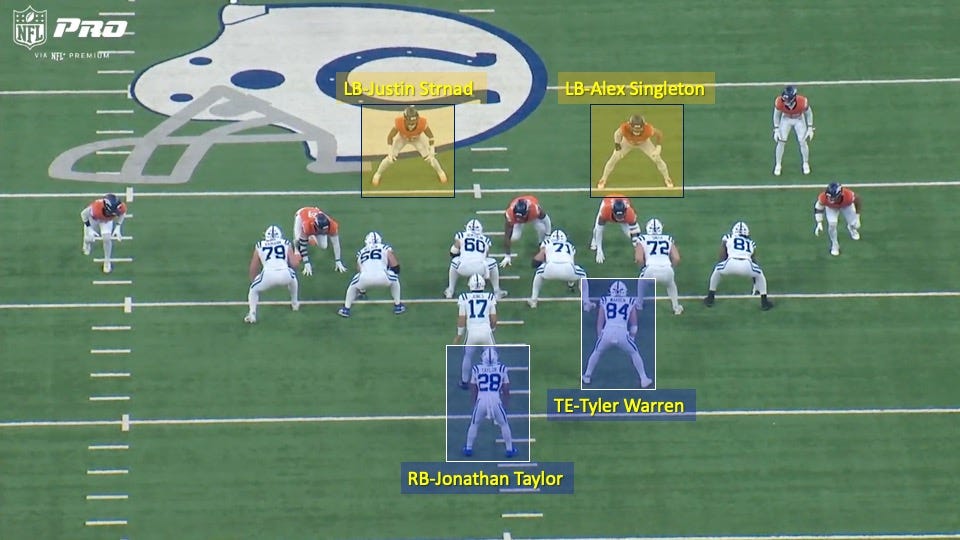 Warren (the better receiving tight end), would now be accounted for by a linebacker instead of a safety. Broncos LB’s Alex Singleton and Justin Strnad would play the releases of Warren and Jonathan Taylor out of the backfield: