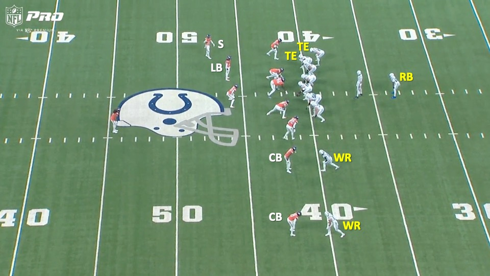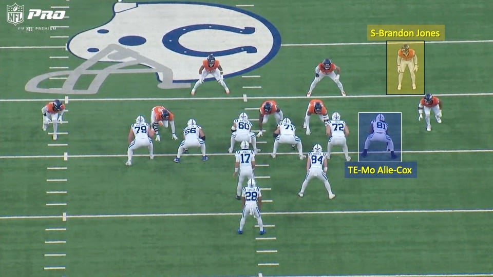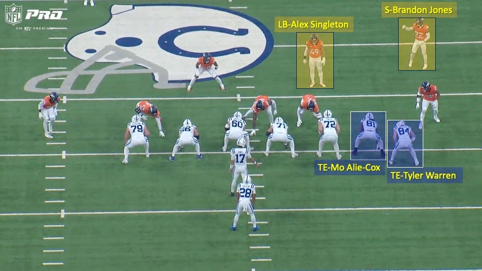 Specifically, the Broncos matched up with safety Brandon Jones over the outside tight end (Tyler Warren) and linebacker Alex Singleton over the inside tight end (Mo Alie-Cox):