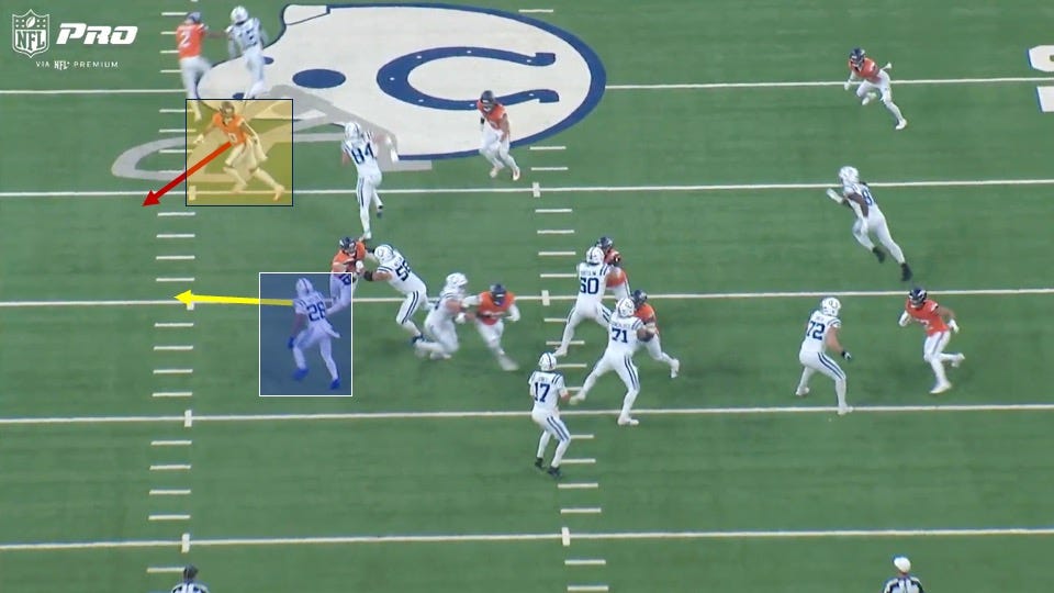You could see Singleton pointing to Warren as if to tell Strnad to run with him. With Jonathan Taylor still behind the line of scrimmage carrying out the run-fake, he interpreted Warren as the first release to the left: