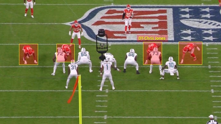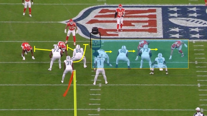 In anticipation of that protection, Spagnuolo would bring 4 weak. That included Tranquill, who would occupy the running back, and cornerback Jaylen Watson, who would be unaccounted for by the protection: