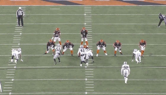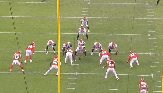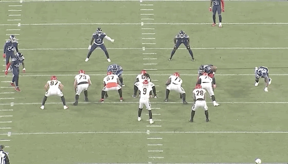 Cincinnati’s protection issues exist across their offensive line. However, the right side has been especially vulnerable of late. Starting right tackle Riley Reiff has been out since Week 14, replaced by back-up Isaiah Prince (#75):