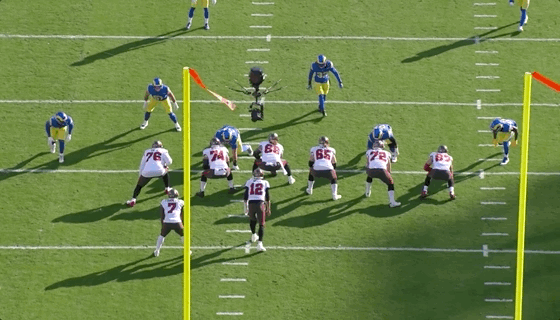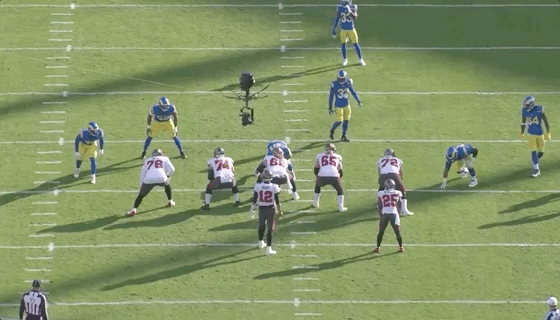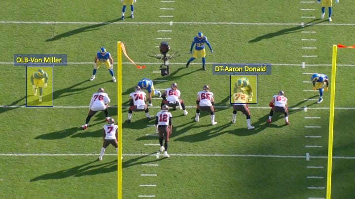 He’ll do this in several ways from various alignments. We’ll see Donald and Miller split to opposite sides of the formation at times, forcing the O-line to slide in one direction and leave a 1-on-1 to the other side. Here, the Buccaneers’ O-line slid to Donald’s side leaving Miller singled up off the edge: