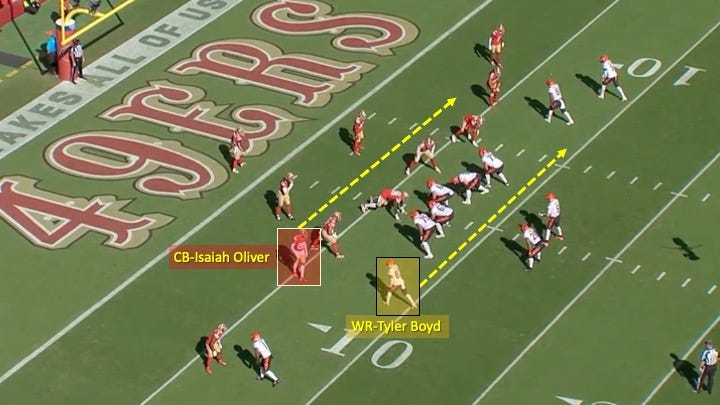 Boyd was left alone vs. Oliver with a lot of space to operate to the outside since he was running his route from that inside #3 position.