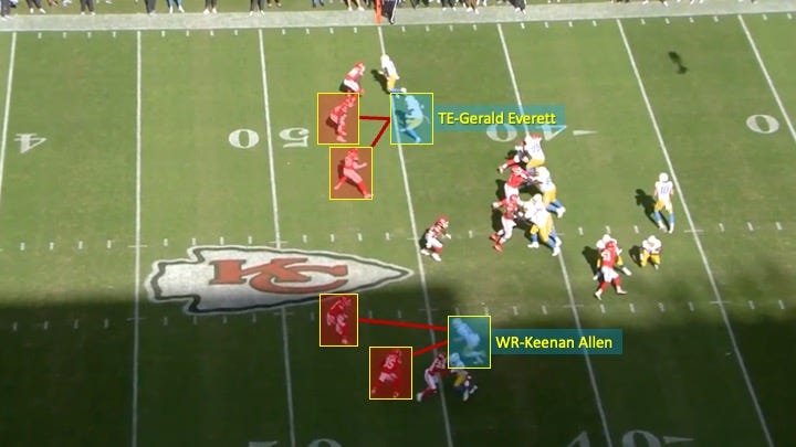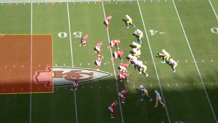It started on L.A.’s first drive of the game. The Chargers faced a 3rd-and-2 from their own 43-yard line. The Chiefs aligned in what appeared to be cover-0 or some form of combo-man coverage with no deep safeties: