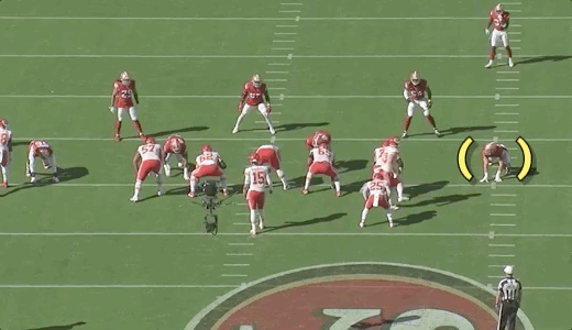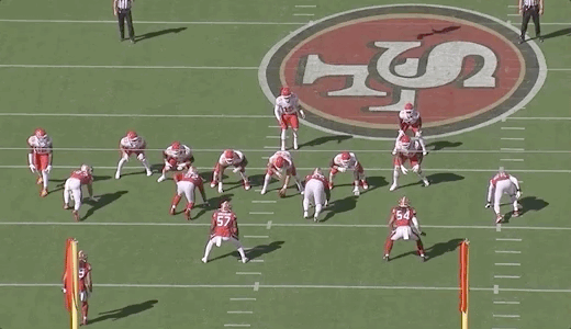 Reid kept the 49ers’ pass rush off balance from the start. He used screens, moving pockets, sprint-outs, chips, and various runs intended to force hesitation in Bosa. Reid wanted to keep him from pinning his ears back and aiming for the same launch point with his pass rush on every play. He wanted to put a little doubt in his mind and make him worry about a possible screen or run to prevent him from getting upfield quickly and attacking the quarterback.