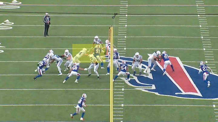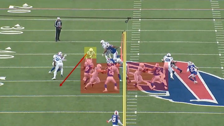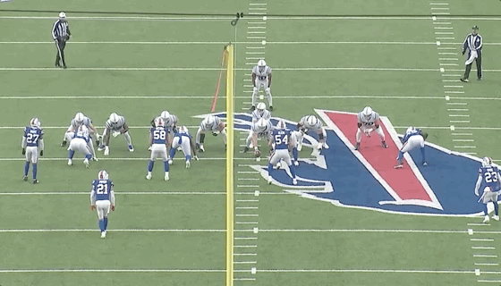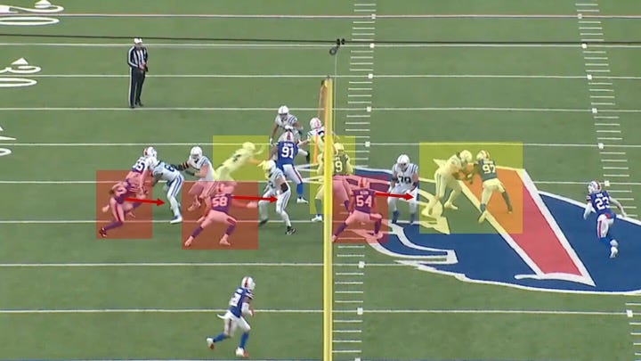 That’s a great way to keep linebackers from trusting what they’re seeing the rest of the game, especially if they’re keying on the guards. The Colts ran this play multiple times against Buffalo. They ultimately racked up 264 yards and 4 TDs on the ground and finished the day with 41 points.