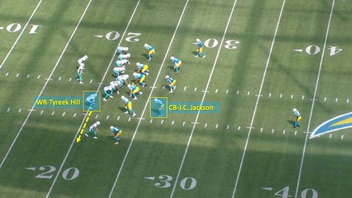 Using this short motion so late before the snap made it difficult for the Chargers defense to adjust. It also ensured that Hill would get a free release off the line, which maintained the timing of the play for Tua:
