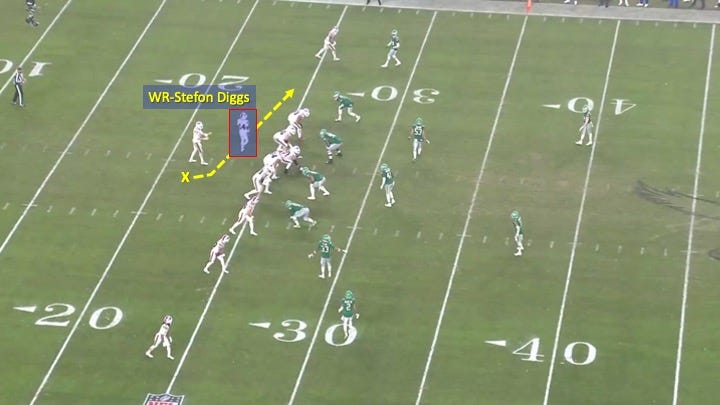 The Bills started this snap in a 3x1 formation with wide receiver Stefon Diggs in the backfield. Then they motioned him to the single-receiver side: