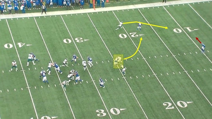 The Eagles would also run a post to the side of the over, another ploy to help guide Pinnock toward that side of the field: