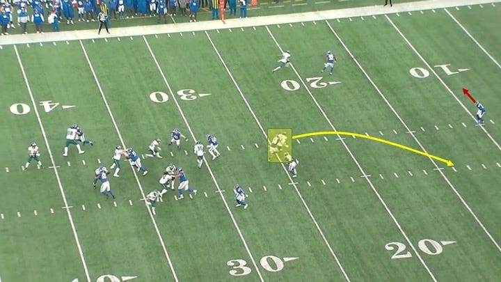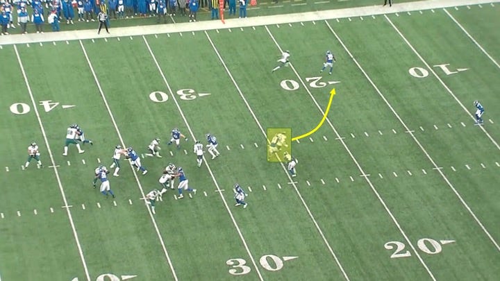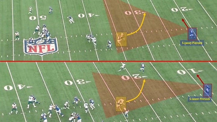 I don’t know if the Eagles game-planned this during the week or if they saw how Pinnock was reacting to the previous over routes and figured it was time to attack. Either way, this was a great job by offensive coordinator Shane Steichen of setting up tendencies and then breaking them.