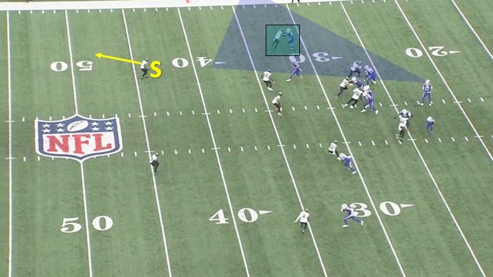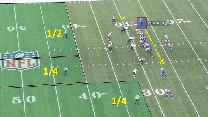 Starting on the first play of the 3rd quarter, New York frequently rolled coverage over top of Diggs’ side. Here, the Bills started in a 3x1 set before Diggs motioned across the formation. The Jets would play quarter-quarter-half coverage (Cover-2 to Diggs’ side, Quarters to the other):