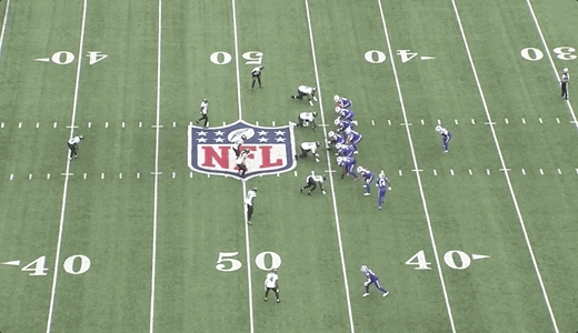 In the first half, Stefon Diggs (Buffalo’s best weapon outside of Josh Allen), caught 5 passes for 93 yards. 4 of those came against single-high coverage, including the first play of the game. That’s Diggs (#14) motioning across the formation: