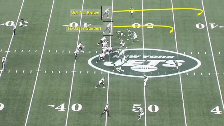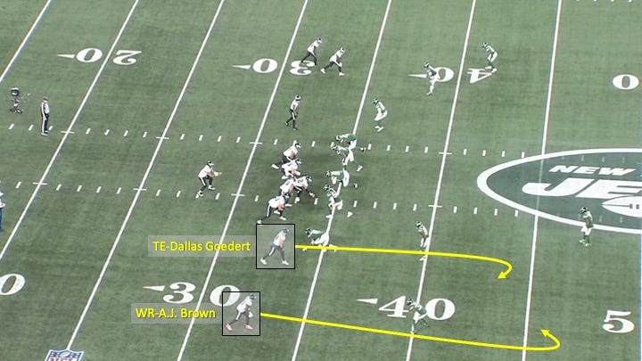 In fact, just 3 plays earlier on a 3rd-and-7, the Eagles had run the same route concept to the other side of the field with tight end Dallas Goedert and wide receiver A.J. Brown: