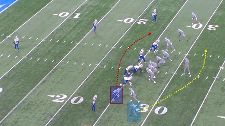 The Lions then sent Raymond in orbit motion across the formation. But this wasn’t one of those motions where the receiver slowly saunters across the field. Instead, Raymond went into a sprint, which is something you normally see right before the snap. So the Bills couldn’t just easily check into an entirely different defense to handle the new 4x1 formation.