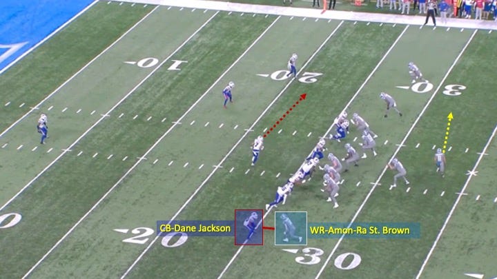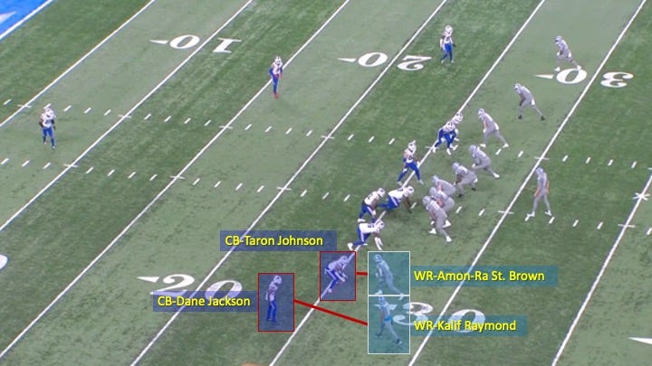 So the objective for the Lions was to find a way to get St. Brown matched up inside on one of Buffalo’s other corners who generally aren’t as comfortable or effective playing in the slot. Cornerback Dane Jackson, who spent just 2% of his time in the slot last season (according to PFF), would be the target.