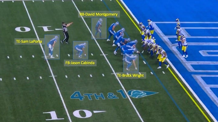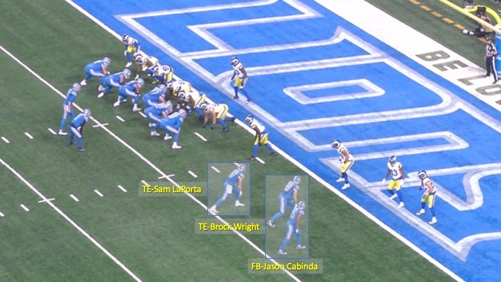 The two most athletic receiving threats on the field were LaPorta and running back David Montgomery, who had shifted to the backfield. The Rams preferred to have linebacker Ernest Jones match up to him if he leaked out of the backfield. That left the one DB on the field (safety John Johnson) and two linebackers to handle the trips bunch: