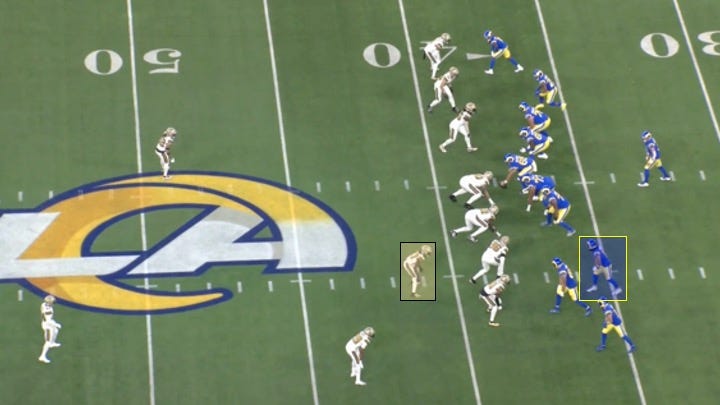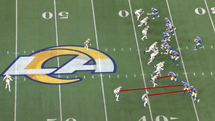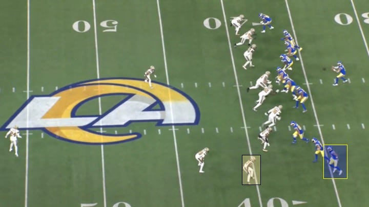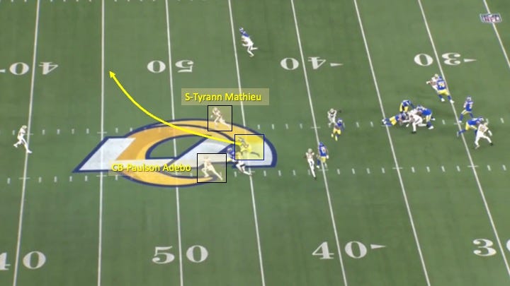 The other route to focus on here was Kupp’s. He would run a deep over, and the Saints were prepared to take him away. The safety on the other side of the field, Tyrann Mathieu, would drop down to the middle and provide help on Kupp inside: