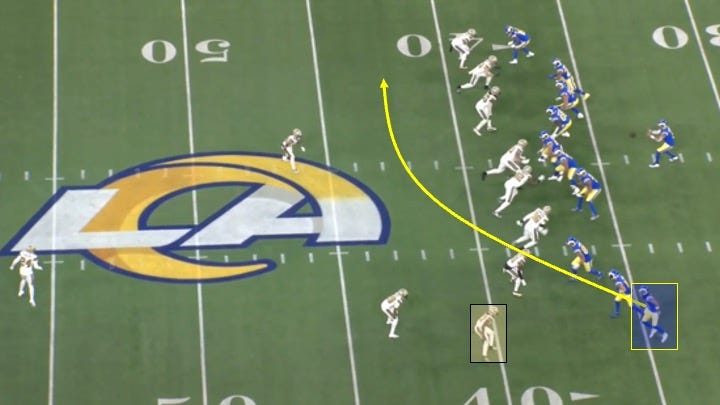 Second, the motion changed the leverage of Nacua’s defender (Yiadom). He was initially aligned inside of Nacua. After the motion, he was outside of him: