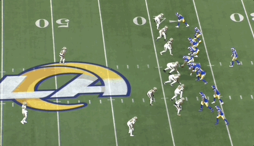 This first example was a 3rd-and-6 on their opening drive. The Rams came out in a 2x2 formation and would then use 3 different shifts and motions. First, Kupp would motion across the formation, creating a trips-bunch to the left. Cornerback Paulson Adebo followed. This was an indicator of man coverage: