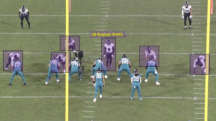 This was a 3rd-and-10. Baltimore aligned with 6 potential pass rushers near the line of scrimmage. Linebacker Roquan Smith stood over the center, creating a 5-man surface: