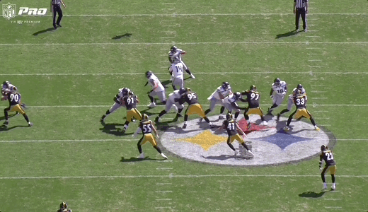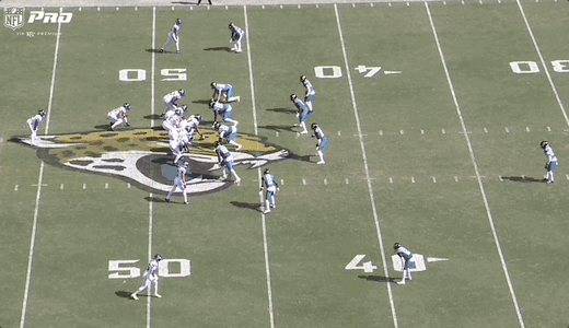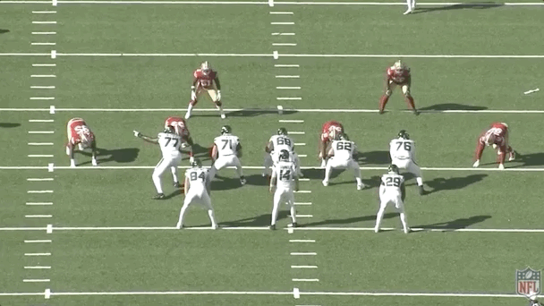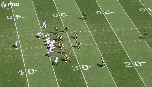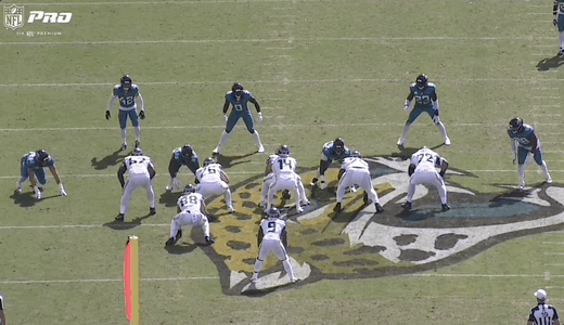 You can see the impact on the pass rush here as well. Watch both D-lines move laterally with the run action and the edge rushers to the right hold up to defend the run: