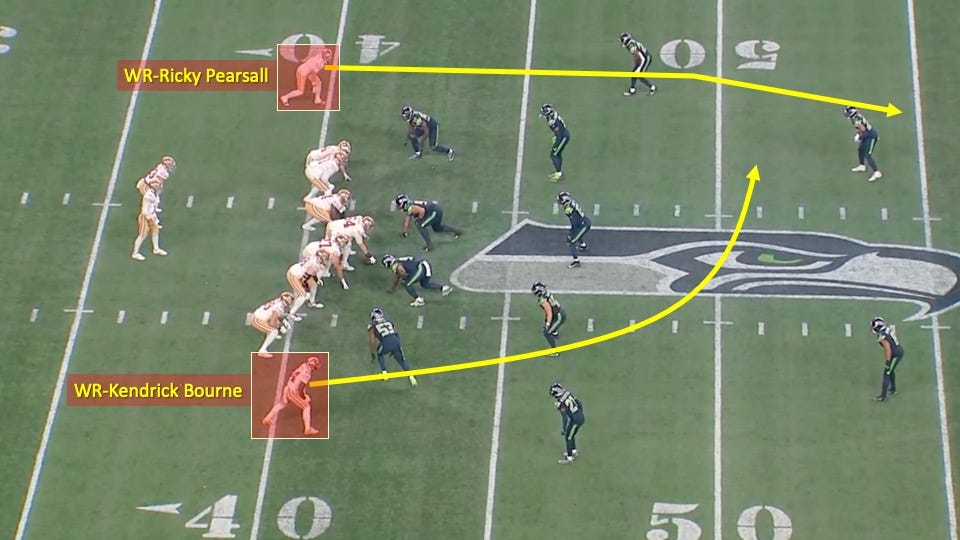The Seahawks would play quarters coverage and lock up the back-side receiver (Kendrick Bourne) with cornerback Devon Witherspoon: