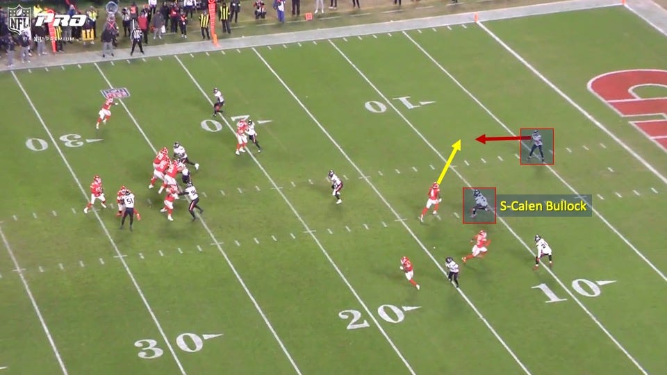 Bullock would also end up passing off his receiver to the free safety and then falling off in the middle to provide help if needed: