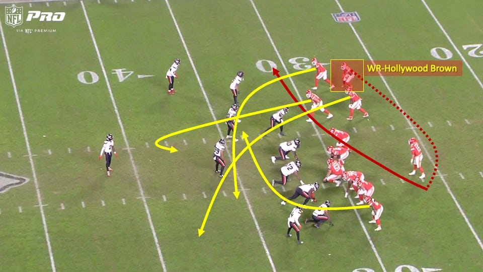 The play they had called was “Mesh Traffic,” with Hollywood Brown motioning from the right side of the formation to the left before sneaking back out to the right after the snap: