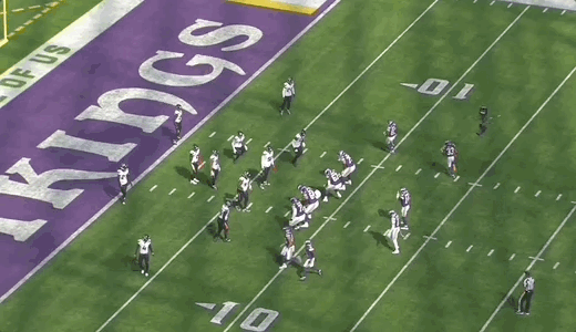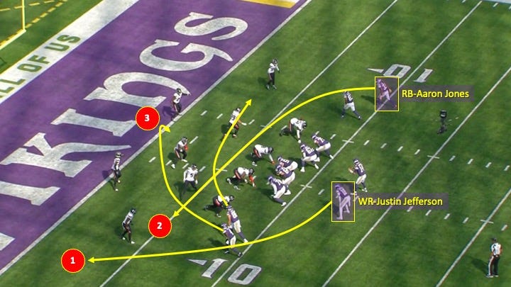 In this game, they were particularly zone heavy. So O’Connell attacked by getting Justin Jefferson working the middle of the field off of play-action on early downs.
