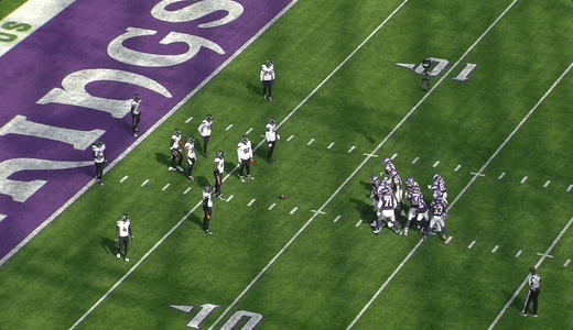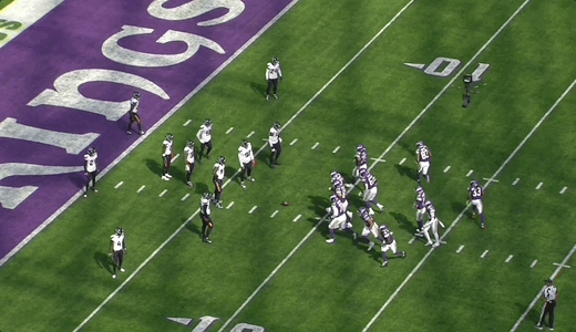 First, notice how the Vikings broke the huddle and raced up to the line before snapping the ball quickly:
