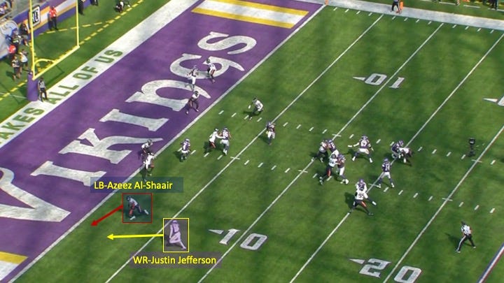 But Al-Shaair actually did a decent job of fighting through traffic and getting over top of Jefferson. So Darnold would move to his second read, Aaron Jones.